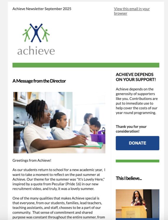 As our students return to school for a new academic year, I want to take a moment to reflect on the past summer at Achieve. Our theme for the summer was “It’s Lovely Here,” inspired by a quote from Peculiar (Pride 16) in our new recruitment video, and truly, it was a lovely summer.